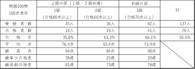 各級別の試験結果及び合格者の受検番号を、また、上級の部と初級の部に区別して但馬検定の点数で順位を競う「個人戦」の結果を下記に掲載します。